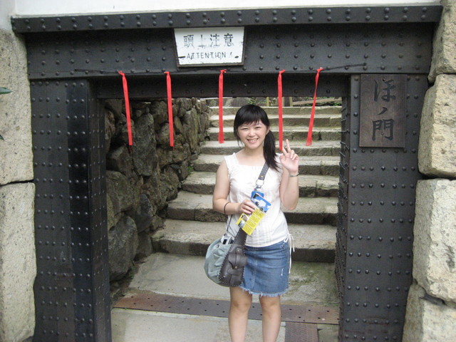 接近姬路城,眼前就是一大片的柳樹,今兒個不是很熱,太陽沒有很大,微風徐來,柳樹也隨著風搖曳生姿,好不美麗。踏進姬路城,遠遠地就可以看到姬路主城矗立在眼前,很雅緻的感覺。買好票走了進去,一邊看著漂亮的姬路城,一邊感受著遙遠的古意,欣賞著建築的美,觀望著雕刻的精細;雕刻雕的是城主的家徽,每一代城主都有不同的家徽。走著走著,還有看到「頭上注意」的mark,我走過去撞不到,逸亭走過去就會敲到頭了,所以古代的武士們應該跟我差不多高,有矮 囧rz。順著路走,看著舊時的燈檯、一些有著歷史故事的物品、古時的米倉,終於走進了姬路城的天守閣裡。這裡面是要脫鞋走的,階梯很陡,不知道當時為什麼要把階梯做的這麼陡,走起路來怪可怕的。踩著嘎嘎作響的木頭地板,徜徉在一大片古味裡面,看著當時的釘子、武器架,欣賞著歷代城主的丰采,研究著當有敵人來時衛兵們怎麼應對敵人,似乎可以從濃郁的木頭香裡感受到衛兵們震耳的叫喊聲。進去裡面漫步真的是一種享受,好像到了當年的時代,不需要冷氣空調,天守閣內就是擁有著涼意。裡面還有擺放著武士們的盔甲,不過我承認我金田一看太多了,看到盔甲還真感覺挺毛的 囧rz。沿著路標一層一層地往上走,終於到了天守閣的最上層,此時往來時路看去,真的是很黑,跟最上層的明亮完全相反,似乎伸手不見五指,有種從深淵中走出的感覺,哈。最上層有個小小的神社,應該是祭祀當時城裡的信仰神明,可能是信仰中心吧。走出天守閣,逛著城的周邊,有個腹切丸,那裡是個檢視人之席和洗首水井的地方,我的老天,所以應該是以前人被砍頭後洗腦袋的地方吧,有夠可怕的 囧。走著走著,還看到了阿菊姑娘的水井,有看過怪談的應該都知道這個鬼故事,雖然是個大白天,不過還是會怕怕的,不敢多做停留就閃人了^^”。