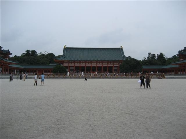 今天7/7,日本過的是陽曆的七夕情人節,不過這不是重點,哈。因為覺得京都還有很多地方我們沒有逛到,加上我們兩個沒有非常想去環球影城,所以直接把行程砍掉回到京都。搭上JR,到了京都,一樣地買了一日公車券,馬上衝向大名鼎鼎的平安神宮。一下公車,高聳的紅色鳥居矗立在眼前,抬頭仰望著它脖子都會痠。