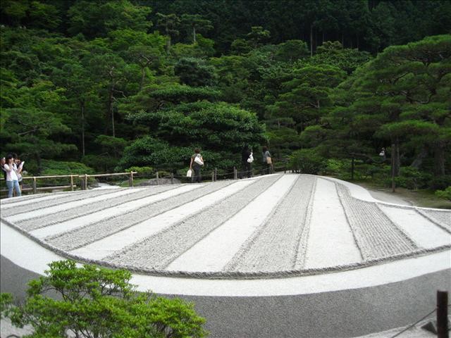 一接近銀閣寺週邊就有整路的店家,當然是賣很多紀念品的地方,因為害怕我們會在紀念品店耗太久趕不上銀閣寺開放時間,所以只好直直衝向銀閣寺。和華麗的金閣寺不同,銀閣寺就這樣破破舊舊地佇立在我們的眼前,一度讓我們以為是不是走錯了地方。銀閣寺是足利義政將軍仿照他爺爺建的金閣寺建造的,可是因為不能超過爺爺的絢麗,所以銀閣寺是採內斂的美。外面有個向月台,一席銀沙呈流線型圍繞在其周圍,據說銀閣寺稱為銀閣寺的原因,就是因為月光照在門前的這片白沙上,經由反射投射在閣中,所以以此命名。